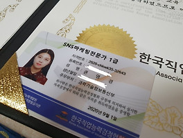 이렇게 반짝이는 수료증과 자격증, 그리고 카드형을 보내줍니다.열심인 결과가 멋지게 도착하니 스스로 너무 뿌듯했어요.협회에서 인증하는 SNS 마케팅 전문가 1급 자격증을 얻을 수 있어서 기분이 너무 좋아졌어요.
